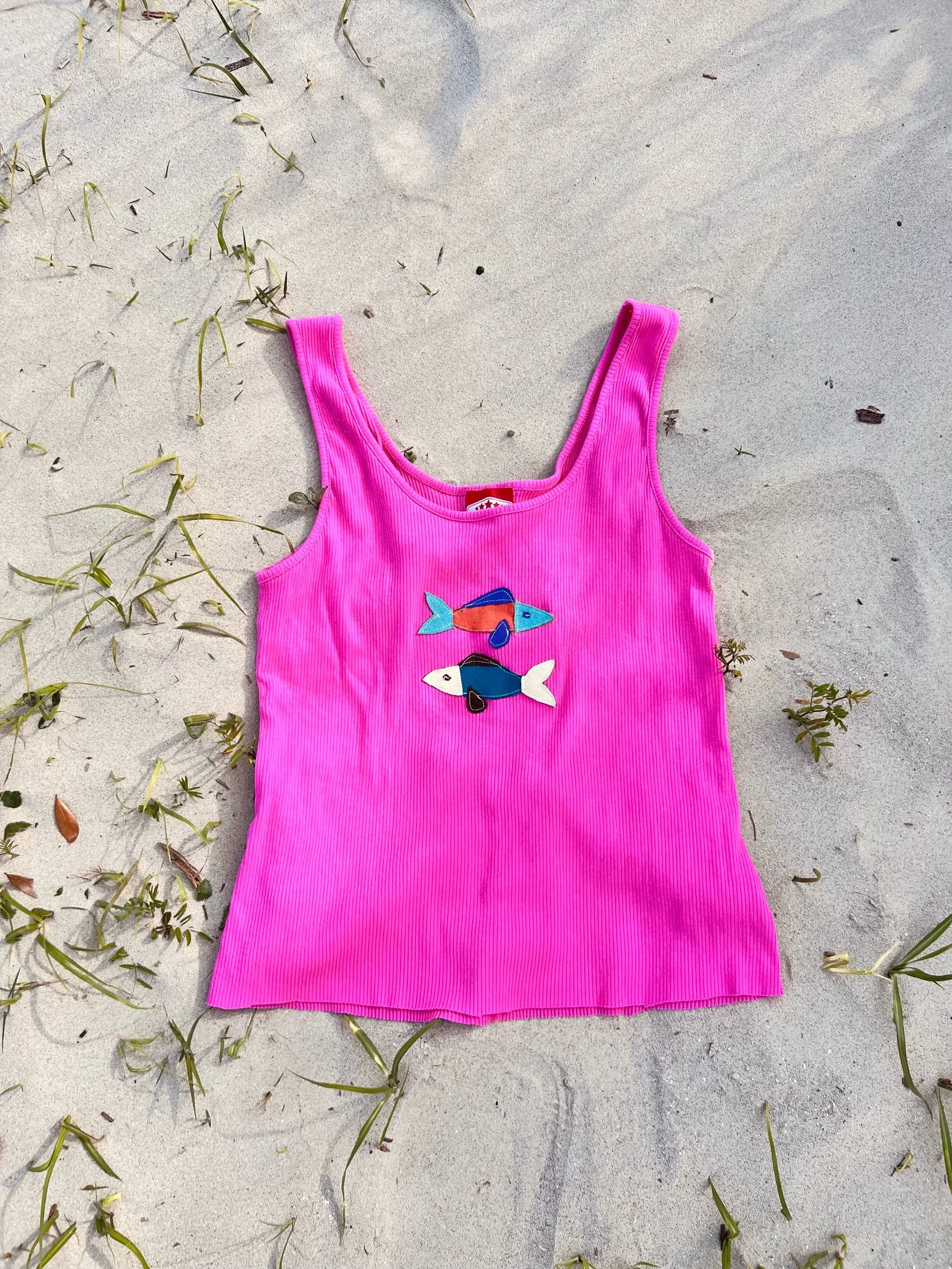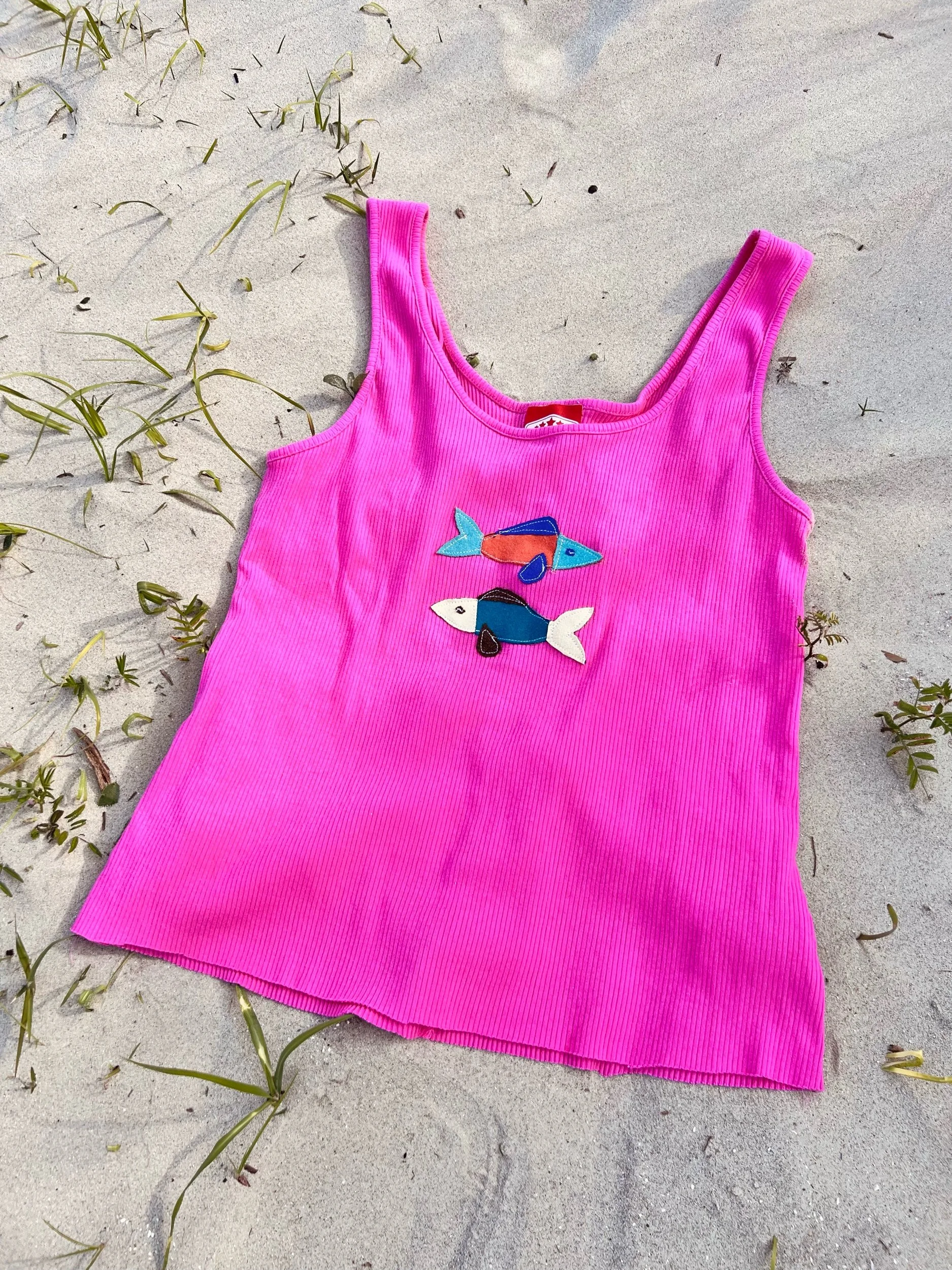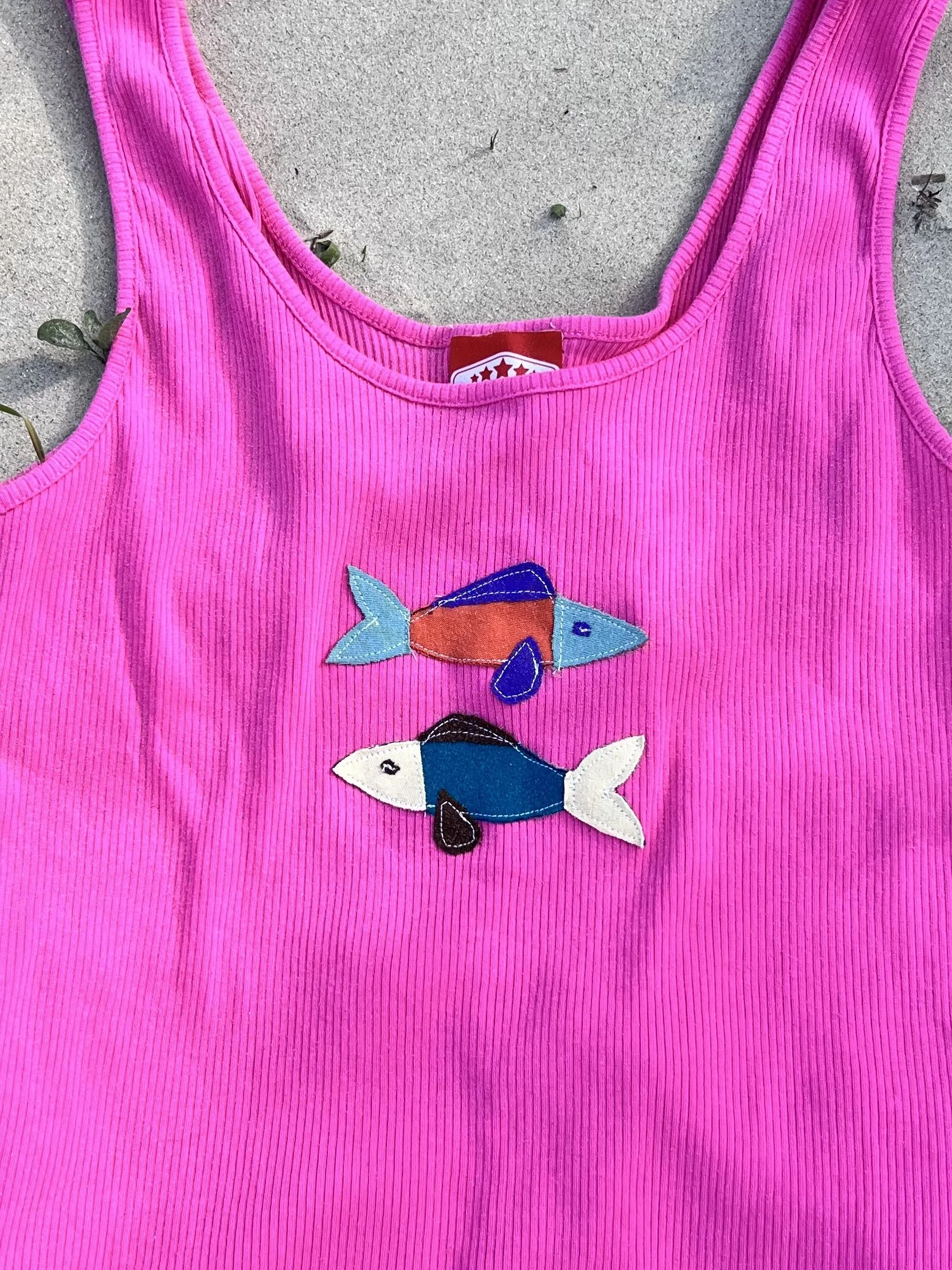 Made from a pre-loved tank top and fabric scraps(: