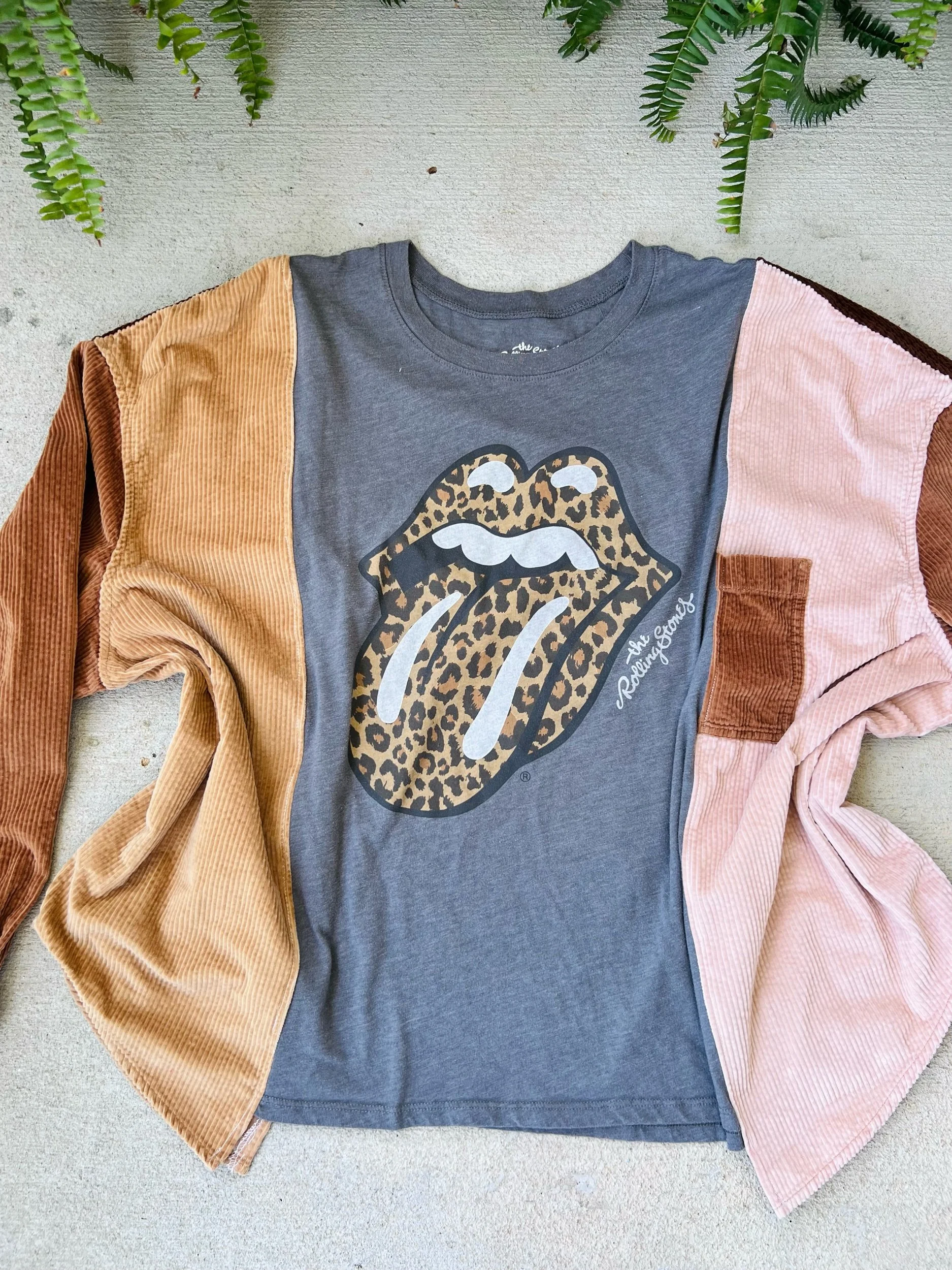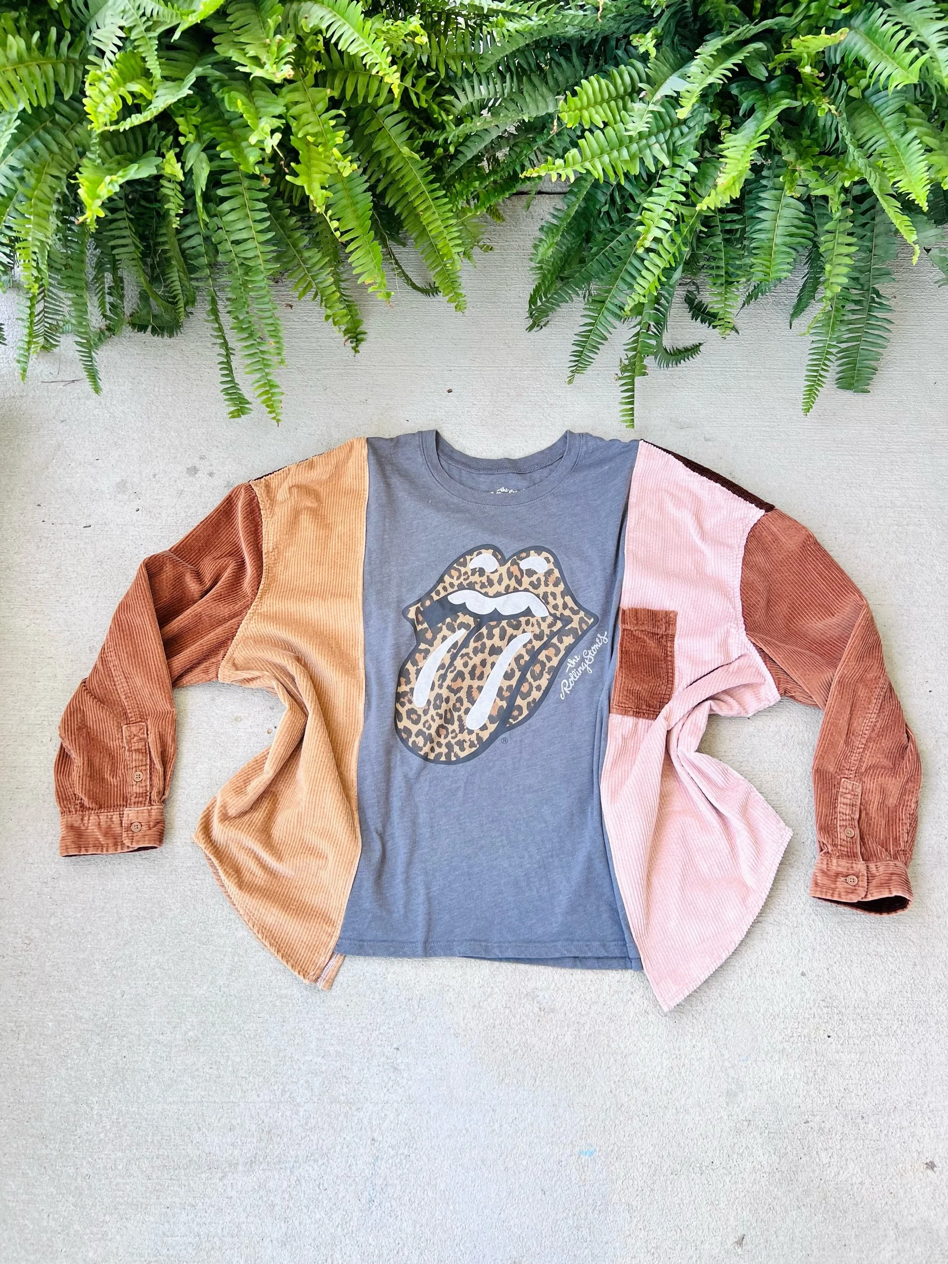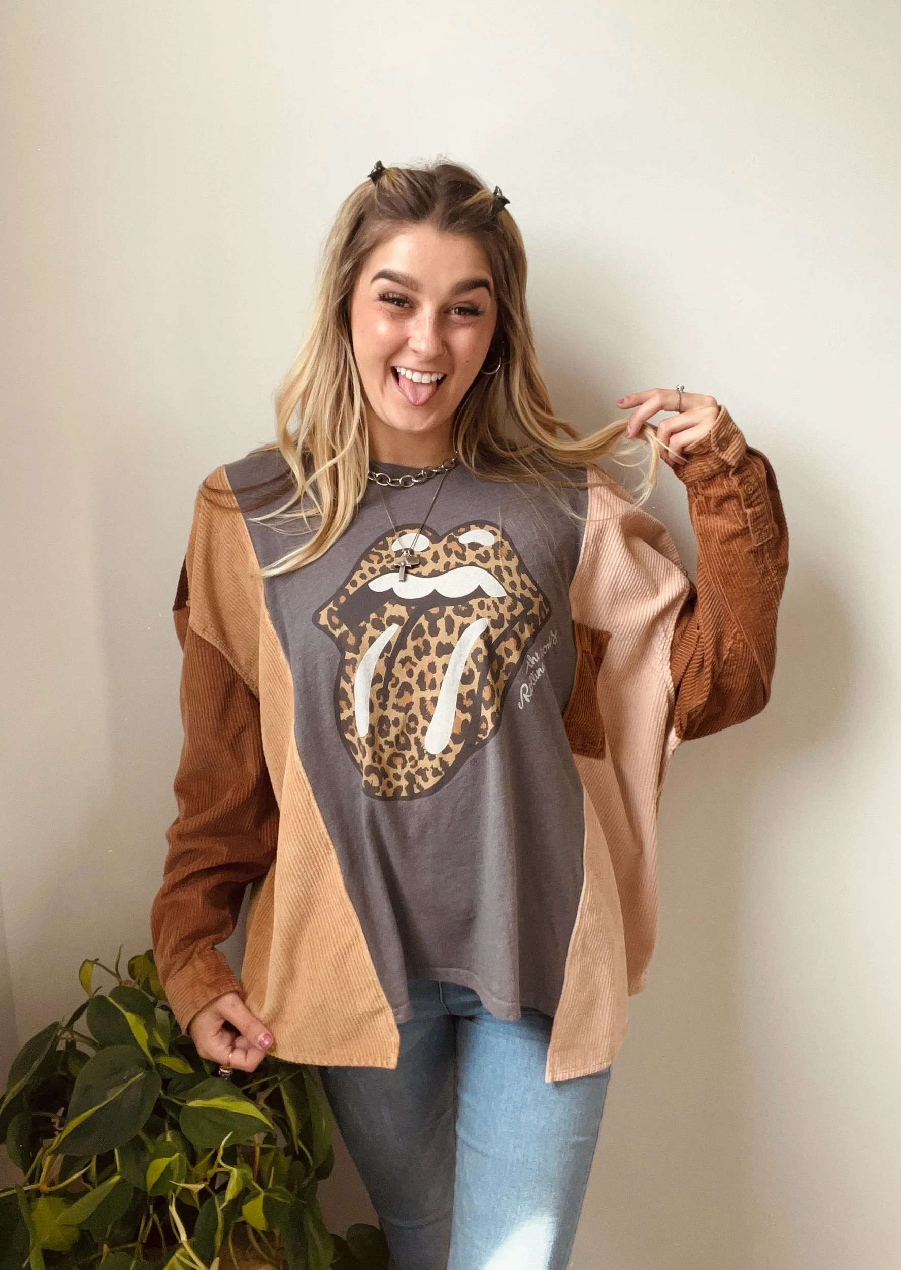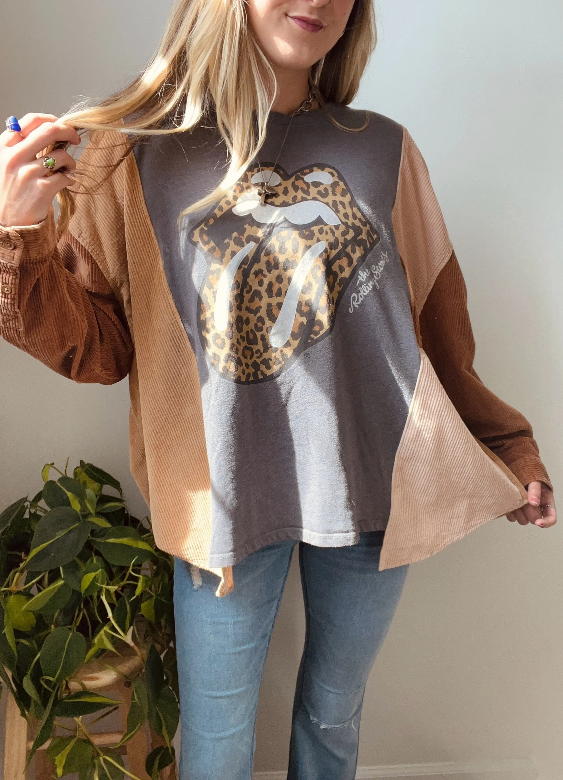 This upcycled Rolling Stones long sleeve is where vintage edge meets cozy texture—crafted from a thrifted tee + reworked button-up for that perfectly undone, effortless vibe!