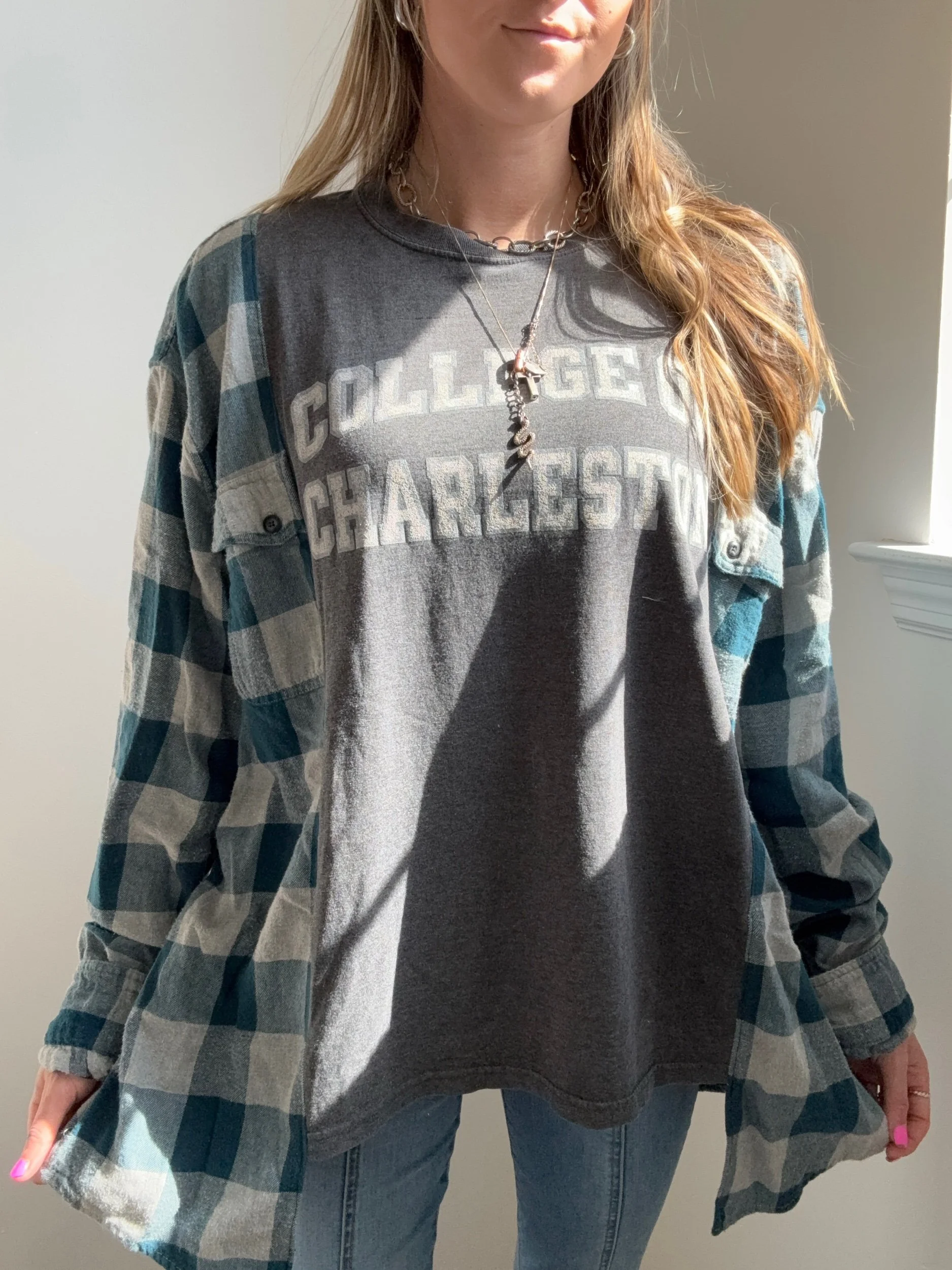 Made from a pre-loved flannel and t-shirt(: