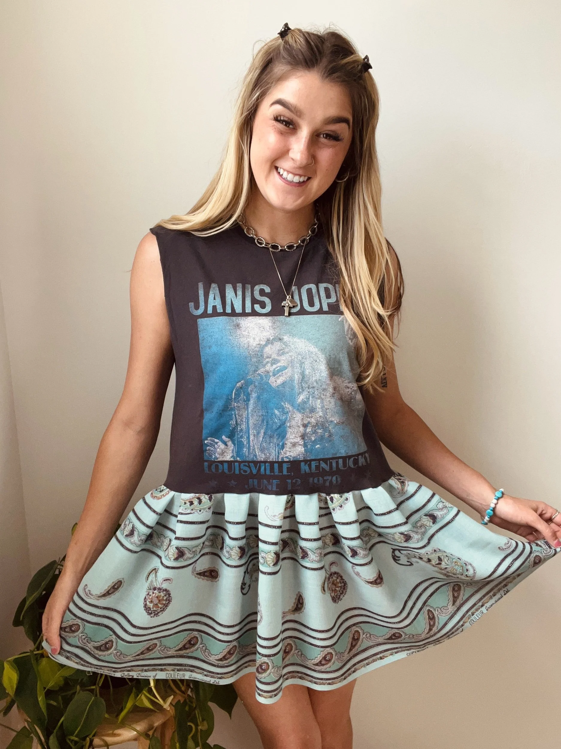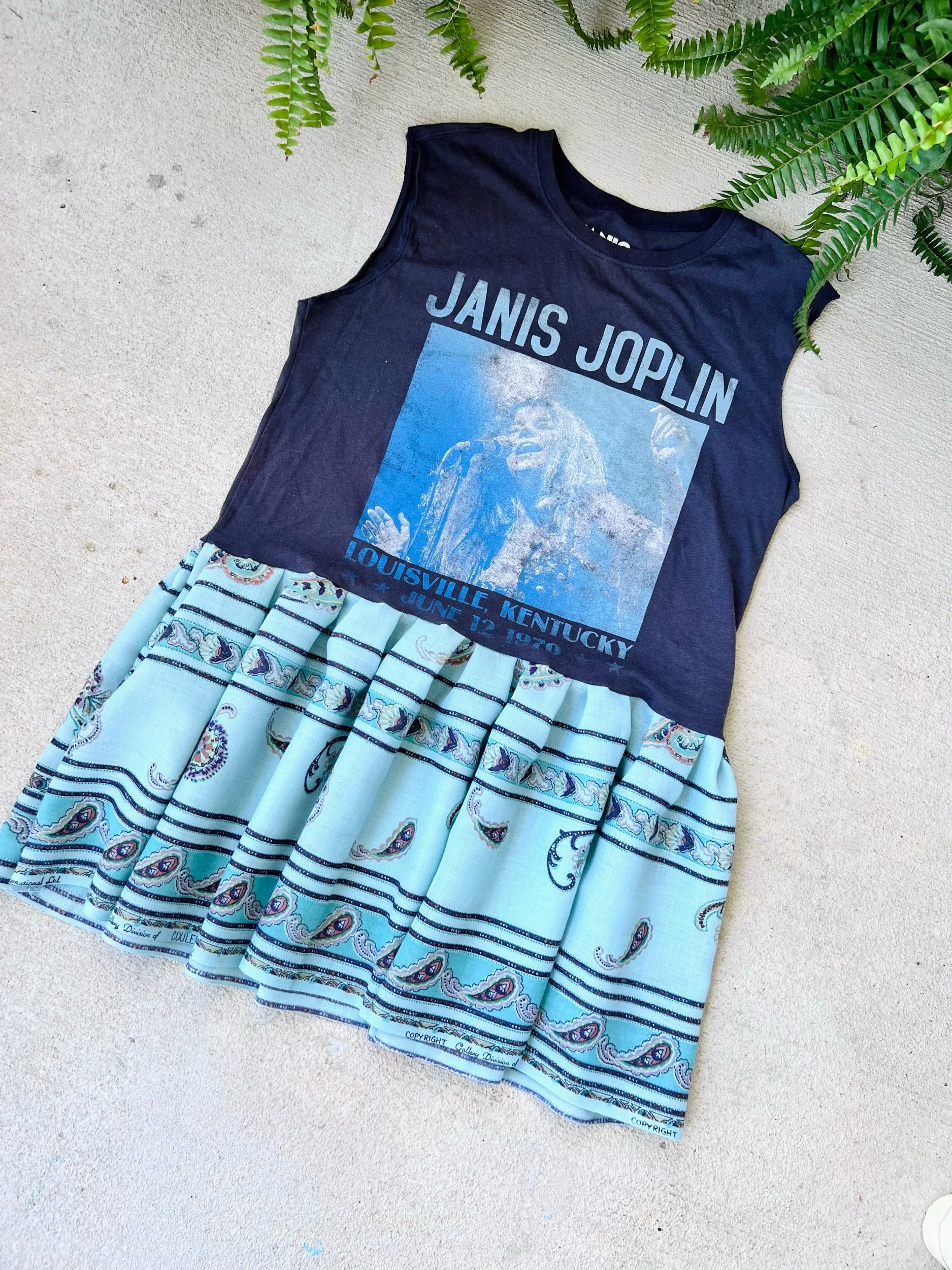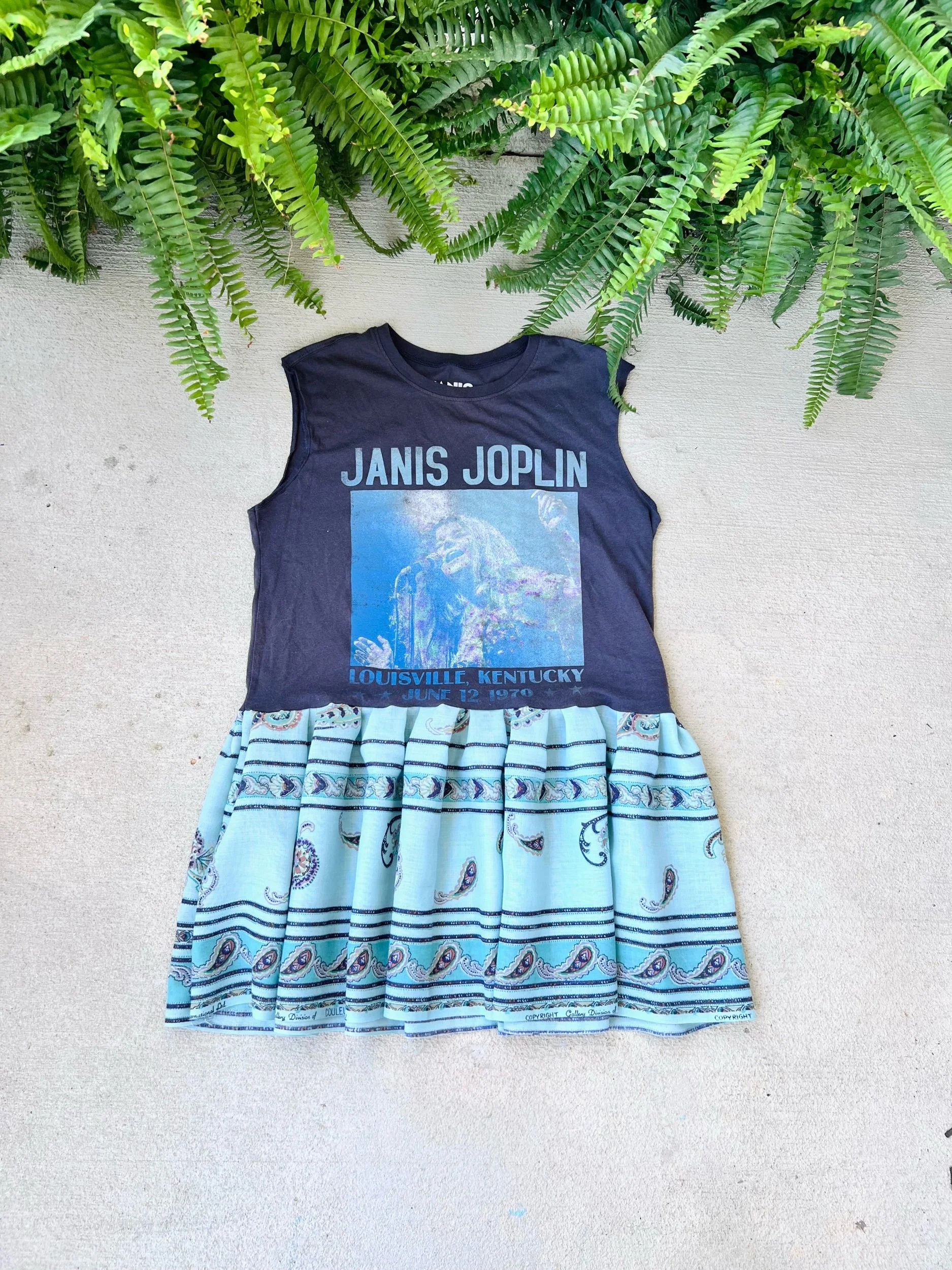 Made from a thrifted Janis Joplin tee and paired with dreamy pre-loved fabric, this piece is where vintage soul meets sustainable style. Soft, flowy, and full of character—just like the legend herself.
